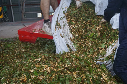 實踐活動中,團隊采用小組分工協作模式,確??撤ァ⒎鬯楹瓦\輸作業的協調與高效??撤バ〗M使用電動高枝鋸將高于4米的油樟樹枝砍下,這些樹枝的樹葉含量最高,是理想的出油原料;粉碎小組將砍伐后的樹枝放入全地形木材粉碎機進行快速粉碎和打包裝袋,達到30千克/分鐘的粉碎速度;運輸人小組則負責將破碎后的油樟碎片運送至工廠加工廠進行過磅稱重,并統一堆放。通過一天的辛勤勞作,實踐隊共計粉碎3.7噸油樟碎片,并成功蒸煮提取了37.6公斤油樟粗油。