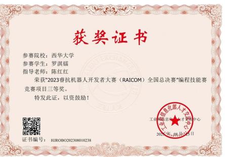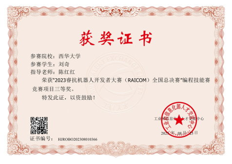 近期,在由工業和信息化部人才交流中心和 RoboCom 國際公開賽組委會舉辦的2023 睿抗機器人開發者大賽(RAICOM) CAIP編程設計賽道全國總決賽中,我校ACM團隊成員獲得國賽一等獎兩項(李紹杰、趙熙)、二等獎一項(馮旭)、三等獎兩項(劉奇、羅淇鐳)的優異成績。