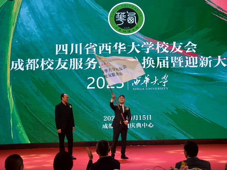 西華大學(xué)成都校友服務(wù)站上屆會長徐和平為會長湯旭東授旗
