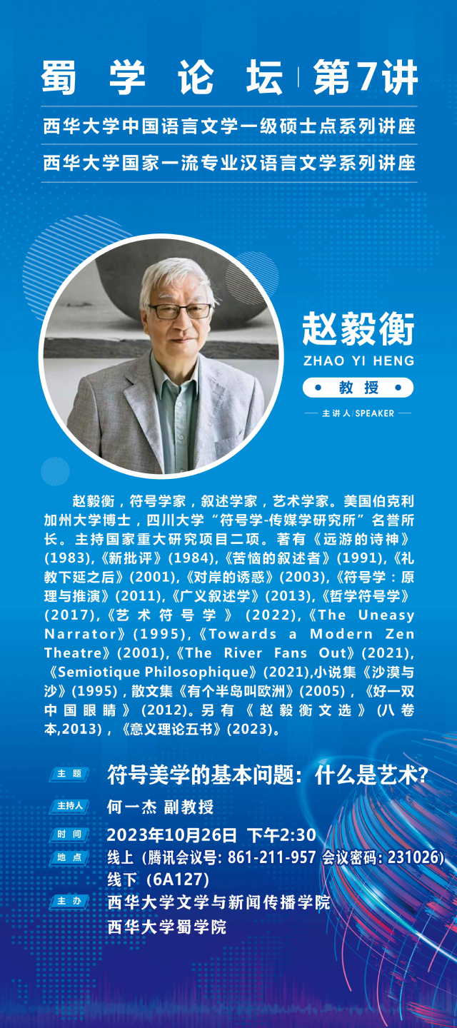 主講人介紹: 趙毅衡,符號學家,敘述學家,藝術學家。美國伯克利加州大學博士,四川大學“符號學-傳媒學研究所”名譽所長。主持國家重大研究項目二項。著有《遠游的詩神》(1983),《新批評》(1984),《苦惱的敘述者》(1991),《禮教下延之后》(2001),《對岸的誘惑》(2003),《符號學:原理與推演》(2011),《廣義敘述學》(2013),《哲學符號學》(2017),《藝術符號學》(2022),《The Uneasy Narrator》(1995),《Towards a Modern Zen Theatre》(2001),《The River Fans Out》(2021), 《Semiotique Philosophique》(2021),小說集《沙漠與沙》(1995),散文集《有個半島叫歐洲》(2005),《好一雙中國眼睛》(2012)。另有《趙毅衡文選》(八卷本,2013),《意義理論五書》(2023)。