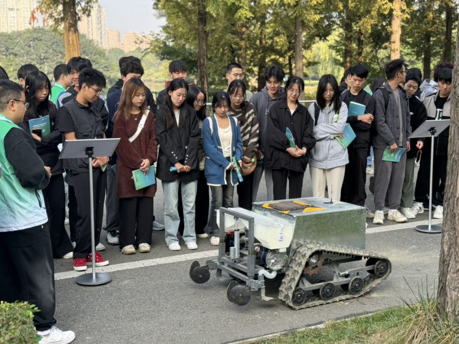 演示區參觀完畢后,師生來到室外展區參觀學院主要農業機械裝備成果。2CM-2B馬鈴薯精量種植機、梳齒式川芎收獲機、窄幅履帶式玉米聯合收獲機、履帶式旋耕機、玉米播種機器人、川芎收獲機等一大批農機創新成果,依次陳列。每臺機械旁都配有展板介紹農業機械的工作原理及適用場所。"這臺機器主要應用于玉米收割,齒輪設計……"志愿者們一邊介紹農業裝備相關知識一邊進行演示,模擬農業機械運作情況。此外,一種自行走式精準農藥噴灑車、自動對行自走式結球類蔬菜收獲機、遙控履帶自動式樹苗栽植機等智能農業裝備創新設計作品也引起了現場師生濃厚興趣和熱烈討論,活動還吸引了一些學校科技園入住企業人員、教師家屬及小孩前來觀看。
