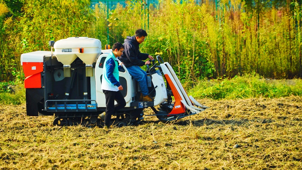 參觀學生在志愿者幫助下體驗水稻收割機操作