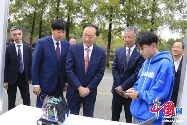當日下午,林高演一行還來到西華大學,參觀了校園。從該校南大門出發,沿中軸線經過求是廣場、明德廣場、卓越廣場,至三樂橋下車,林高演一行步行來到天籟湖畔,沿途參觀了學生文化活動、學生科創集市和學校科技成果展,并聽取了講解員介紹學校的基本情況和近年來取得的成績。