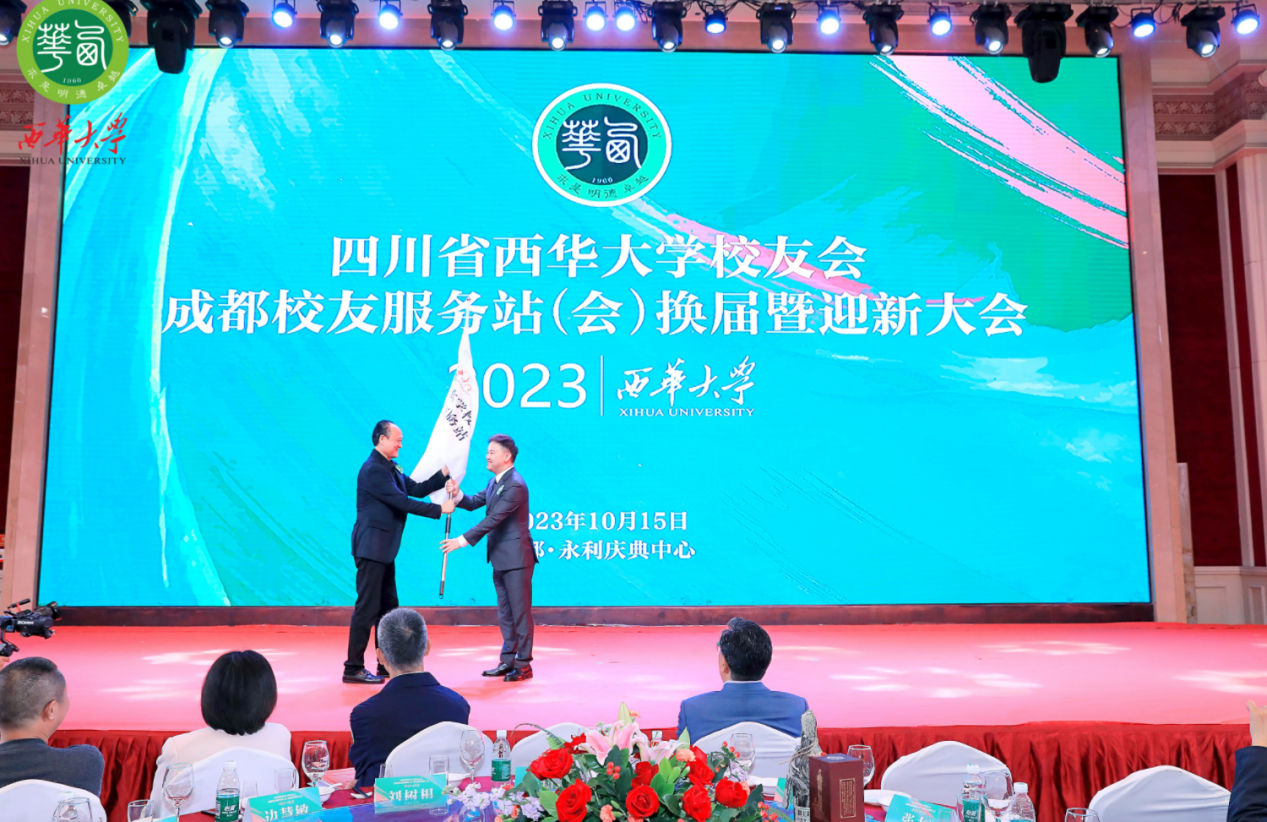 西華大學成都校友服務站上屆會長徐和平為會長湯旭東授旗