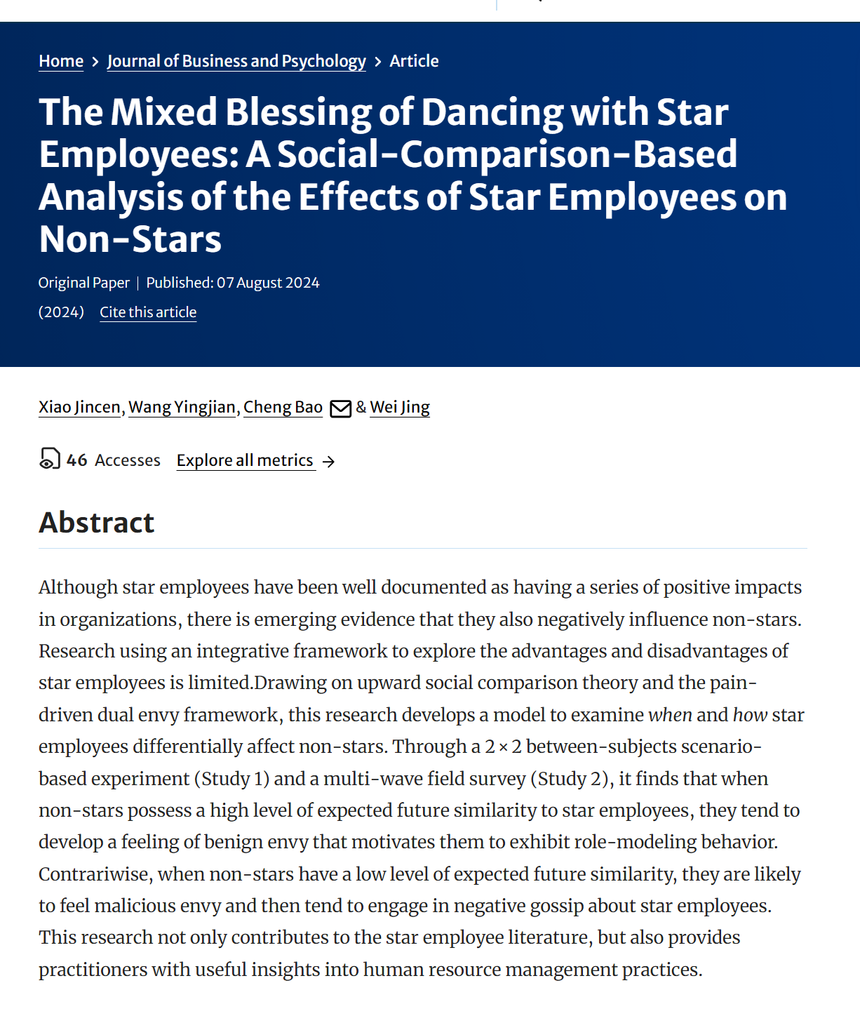 近日,管理學院教師肖金岑課題組在SSCI一區期刊《Journal of Business and Psychology》發表了“The Mixed Blessing of Dancing with Star Employees: A Social-Comparison-Based Analysis of the Effects of Star Employees on Non-Stars”。該論文依托于肖金岑教師獲批的教育部人文社科青年基金,旨在系統性地對組織管理中的“關鍵少數”——明星員工的混合效應進行研究,目前已產出一篇CSSCI和二篇SSCI論文。本篇論文由課題組內的研究生和校外合作者共同參與完成。