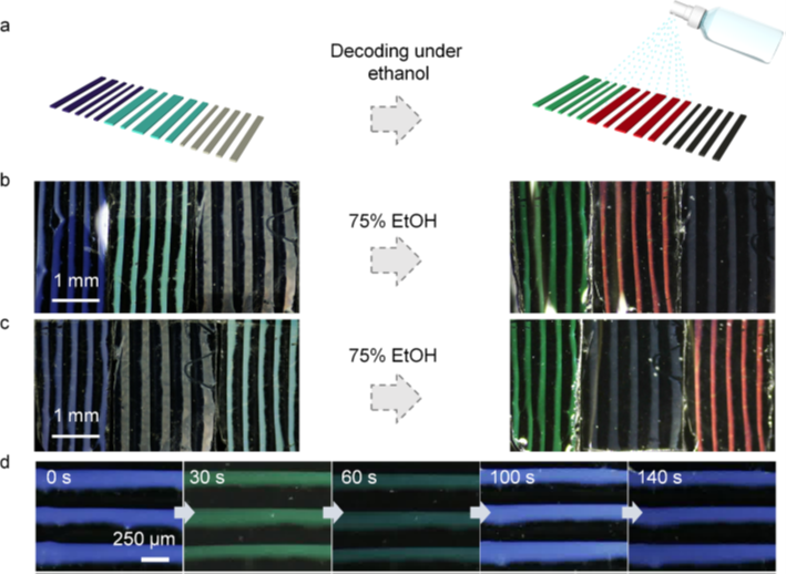 針對(duì)以上問題,該團(tuán)隊(duì)基于前期研究基礎(chǔ)設(shè)計(jì)了一種通過調(diào)控固液氣三相接觸線的快速移動(dòng)在二維或復(fù)雜三維表面組裝納米顆粒的方法,實(shí)現(xiàn)了規(guī)整、可擴(kuò)展和可調(diào)的結(jié)構(gòu)色條紋制備。據(jù)了解,這是首次通過加速揮發(fā)自組裝在大面積基底上實(shí)現(xiàn)了結(jié)構(gòu)色條紋的規(guī)整和可擴(kuò)展生長。并且,通過在組裝表面整合高分子材料,得到了形貌、顏色、表面化學(xué)和環(huán)境刺激響應(yīng)性能可調(diào)的反蛋白石結(jié)構(gòu)色條紋。該研究將獲得的結(jié)構(gòu)色條紋應(yīng)用于防偽識(shí)別、軟體機(jī)器和干細(xì)胞操縱等領(lǐng)域,證明了該自組裝方法和相應(yīng)的結(jié)構(gòu)色條紋在相關(guān)領(lǐng)域的前景和應(yīng)用價(jià)值。