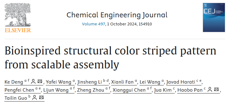 近日,我校食品與生物工程學(xué)院食品營養(yǎng)與安全團(tuán)隊(duì)青年教師鄧科博士在國際Top學(xué)術(shù)期刊《Chemical Engineering Journal》 (Q1, IF: 13.2)發(fā)表題為“Bioinspired structural color striped pattern from scalable assembly”的研究論文。鄧科博士為該論文的第一作者及通訊作者, 2022級(jí)碩士研究生王亞飛為該論文的第二作者,西華大學(xué)為第一通訊單位,陳祥貴教授等團(tuán)隊(duì)老師為本研究工作提供了重要指導(dǎo)和幫助。中國科學(xué)院深圳先進(jìn)技術(shù)研究院潘浩波研究員和西南交通大學(xué)郭泰林教授為該論文的共同通訊作者。