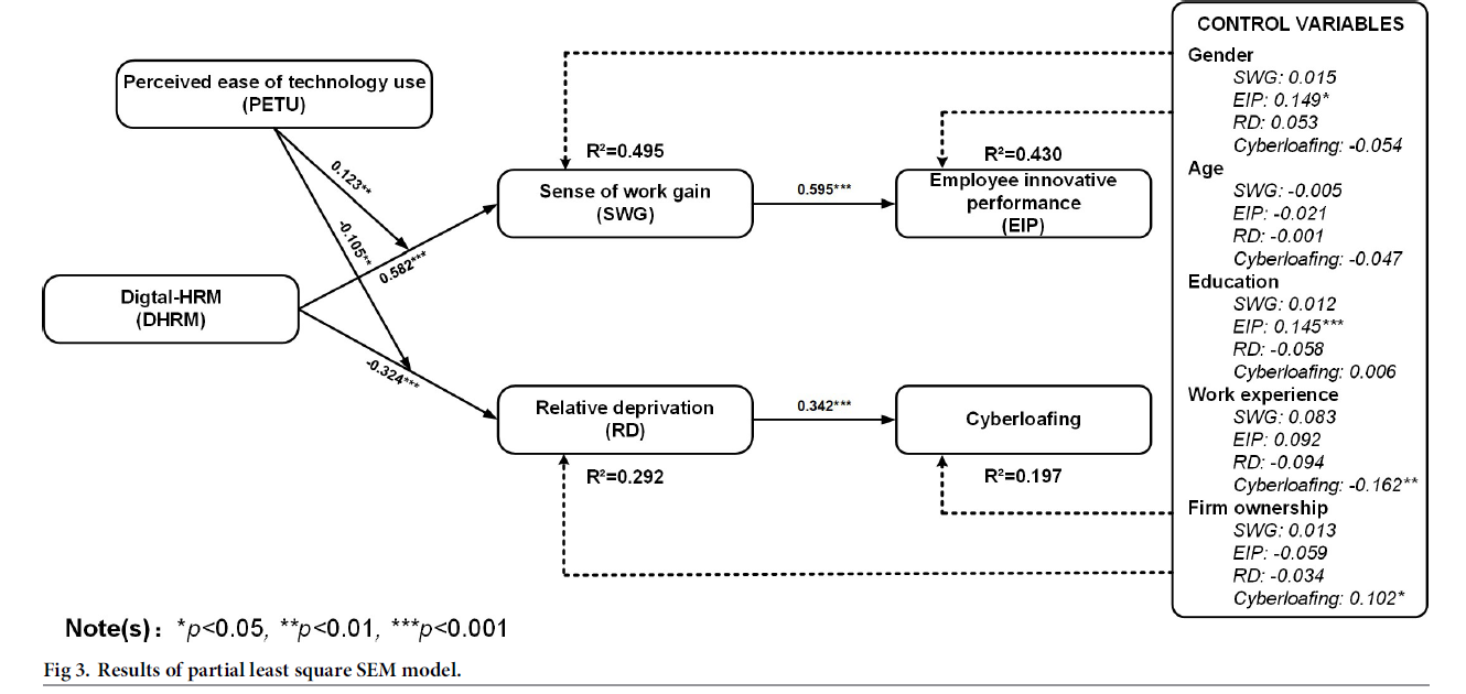 基于工作需求—資源理論,該研究深入探究了數字化人力資源管理(Digital-HRM)對員工的創新績效(EIP)以及網絡閑逛行為(Cyberloafing)的影響,并探究了工作獲得感(SWG)和相對剝奪感(RD)在其中的中介作用以及感知技術易用性(PETU)的調節作用。研究采用定量研究方法,通過三個時點進行線上問卷調查來收集研究數據(N = 487)。采用SmartPLS、SPSS以及Mplus對研究數據進行統計分析,以檢驗和驗證假設。