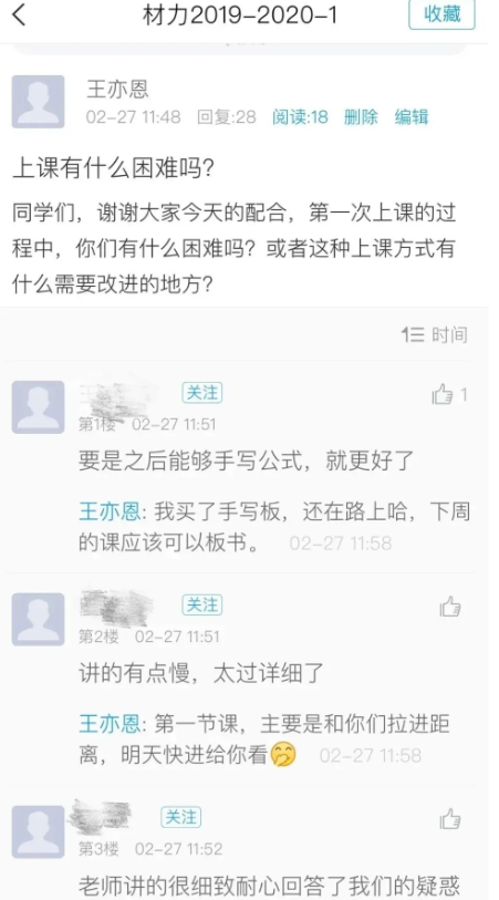 有了前面的準備,接下來就是迎接2月27日上午10點的第一次網絡教學,即使在這之前做好了一切可以做的準備,但是仍然很緊張,夢里夢見的都是課堂混亂的狀態。不過,27日真實的上課狀態卻是十分順利的。每堂課講課時間38分鐘左右,討論7分鐘左右。學生提前告訴我,聽懂了就發一個火箭,沒聽懂就發兩個火箭,這就解決了我擔心的學生掌握程度的問題。