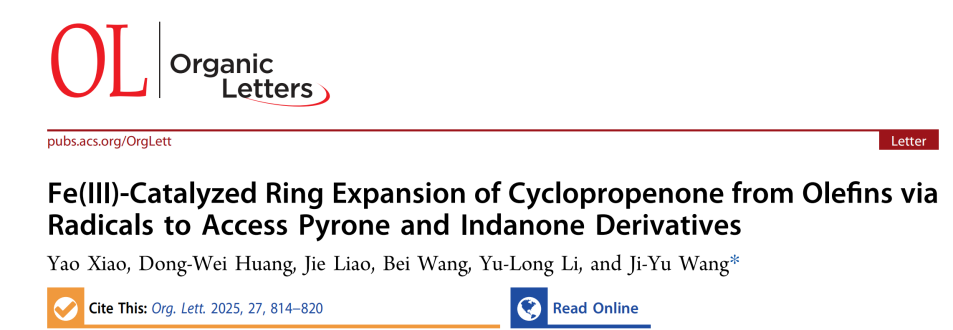 近日,理學院王繼宇教授團隊在國際Top學術期刊Organic Letters(中科院一區,IF = 4.9)上發表題為“Fe(III)-Catalyzed Ring Expansion of Cyclopropenone from Olefins via Radicals to Access Pyrone and Indanone Derivatives”的研究論文,且被評為當期封面文章并進行亮點介紹。王繼宇教授為論文通訊作者,西華大學碩士研究生肖瑤為論文第一作者,西華大學為該論文的第一完成單位。