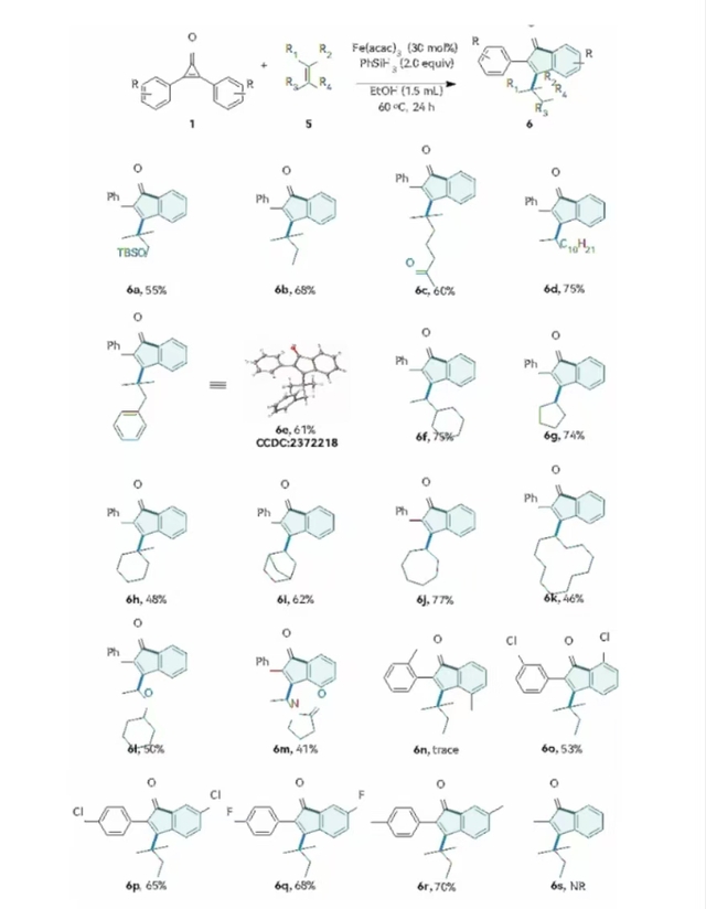 作者以2,3-二苯基環丙-2-烯酮和2-甲基-2-丙烯-1-醇作為模板底物,對該反應的催化劑,還原劑,溶劑,溫度和時間進行篩選,進而確定了最佳的反應條件為:2,3-二苯基環丙-2-烯酮與2-甲基-2-丙烯-1-醇投料比為1:3,以30 mol%的乙酰丙酮鐵為催化劑,2 equiv的苯硅烷為還原劑,乙醇做溶劑,于60攝氏度的油浴鍋中反應24小時,反應收率為78 %。產物結構通過1H NMR,13C NMR,HR-MS、XRD進行了確認。