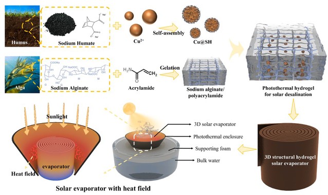 在全球氣候變化和人口增長的雙重壓力下,淡水資源短缺已成為制約人類社會可持續發展的重大挑戰。傳統的水處理與淡化技術往往依賴高能耗或復雜的基礎設施,難以在資源匱乏地區廣泛應用。太陽能驅動的界面蒸發技術因其綠色、低碳、高效的特點,逐漸成為解決水資源危機的研究熱點和發展方向。然而,目前該技術在提升蒸發效率、優化熱管理、實現鹽分回收以及材料多功能集成等方面仍面臨諸多關鍵難題,亟需從材料設計與結構優化等層面開展深入研究。針對這些難題,材料科學與工程學院彭必友教授團隊從生物質材料毛細結構獲取靈感,成功設計并構建出了一種仿生微結構的光熱轉換水凝膠材料。