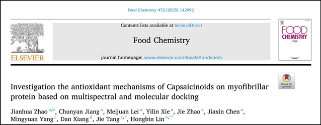近日,食品與生物工程學(xué)院發(fā)酵調(diào)味品科學(xué)與工程團(tuán)隊在農(nóng)林科學(xué)領(lǐng)域國際頂尖期刊《Food Chemistry》(Q1, IF:8.5)發(fā)表題為“Investigation the antioxidant mechanisms of Capsaicinoids on myofibrillar protein based on multispectral and molecular docking”的研究性論文。西華大學(xué)2020級碩士研究生趙建華為論文第一作者,林洪斌副教授和唐潔教授為論文通訊作者。該研究工作得到了四川省科技廳(2023YFN0015)和中國農(nóng)大四川現(xiàn)代農(nóng)業(yè)產(chǎn)業(yè)研究院專項資金的資助。