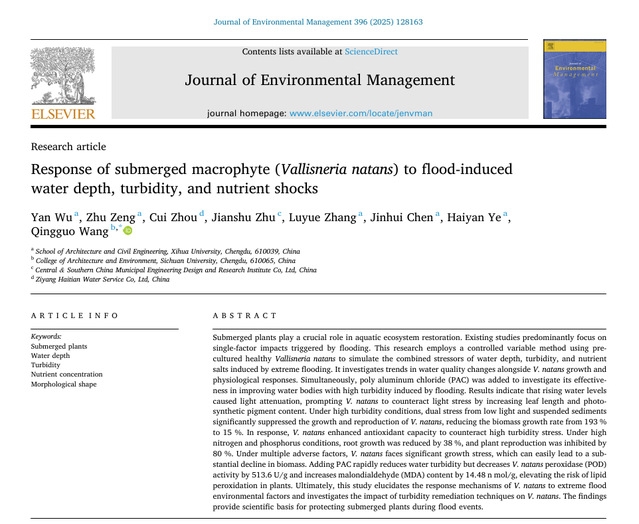 近日,建筑與土木工程學院吳燕副教授課題組在《Journal of Environmental Management》期刊(JCR一區,中科院二區Top,IF=8.4)發表題為“Response of submerged macrophyte (Vallisneria natans) to flood-induced water depth, turbidity, and nutrient shocks”的論文。論文以西華大學為第一單位,吳燕副教授為第一作者,2025級土木水利研究生曾珠為第二作者,四川大學王慶國副教授為通訊作者。