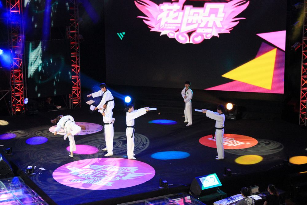 西華大學(xué)跆拳道隊(duì)員作賽前熱身表演