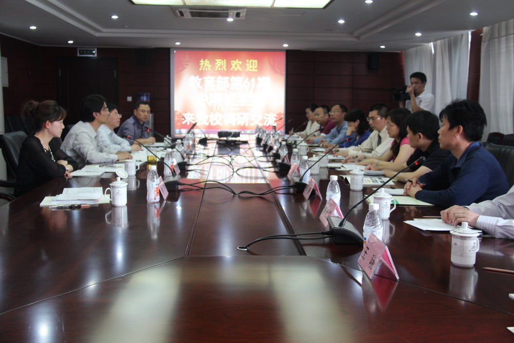 ????? 5月3日下午,教育部中南教育管理干部培訓中心第61期培訓班學員一行10人來我校調研交流。校辦主任費凌、學生工作部部長徐元彬、黨委組織部副部長羅海、研究生部副部長李玲、人事處副處長趙飛等有關部門負責人在行政樓二樓與學員們進行了座談。 ????? 會上,費凌主任對調研組來校考察調研表示熱烈歡迎,并從學校的師資隊伍、學科建設、教育教學質量、科學研究與服務能力、人才培養特色等方面作了介紹。與會雙方就教學計劃、研究生教育管理、人才培養、學生干部教育、學生黨組織的建設、學生工作評估、學校對各社團的管理制度等方面進行了深入交流。在聽取了情況介紹后,廣東工業大學政法學院黨委副書記陳飛旋等對我校的快速發展和取得的成績表示贊賞,并希望加強各高校間的交流合作。